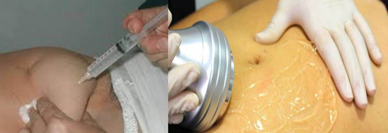 HIDROLIPOCLASIA ULTRASÓNICAConsiste en la inyección de líquido (solución fisiológica 0,9%, Ringer Lactato) en cantidades variables con la aplicación posterior de Ultrasonido para producir la expansión de las moléculas de agua y así la lisis o implosión de las células grasas.